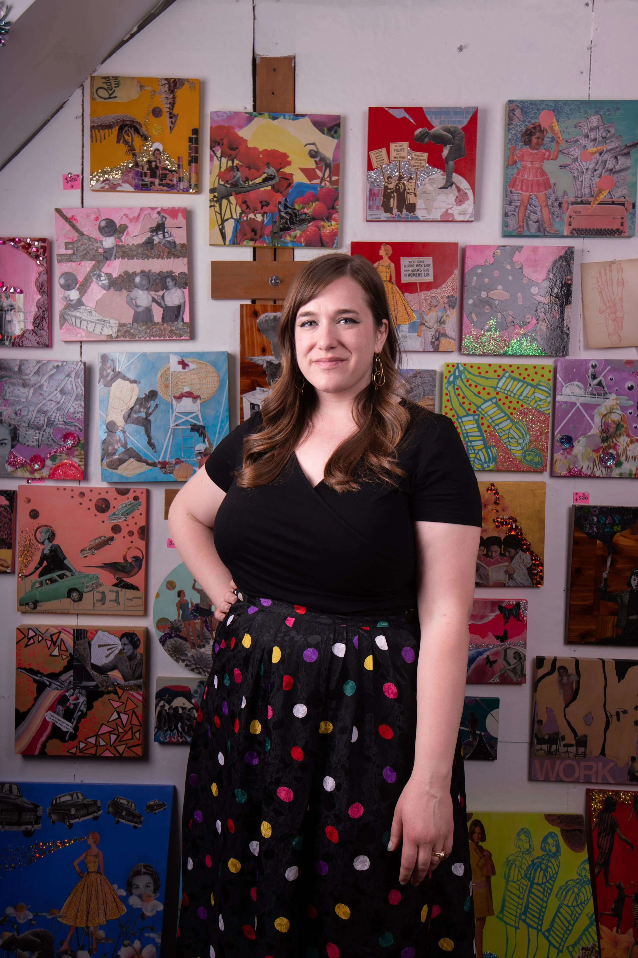 Using a candy-coated, flower-ridden, bright palette and maximalist sense of composition, my artwork tells difficult stories and builds community through collage, photography, painting, sculpture, poetry, and social practice. I approach my work through a feminist lens, exploring body image, gender roles, and social issues. For roughly a decade, I worked primarily as a mixed-media collage artist, obsessively collecting and repurposing an archive of vintage imagery, drawing parallels between traditional and contemporary topics. Expanding my materials and techniques to include a social practice has allowed me to trust my compulsion to create in more experimental methodologies.