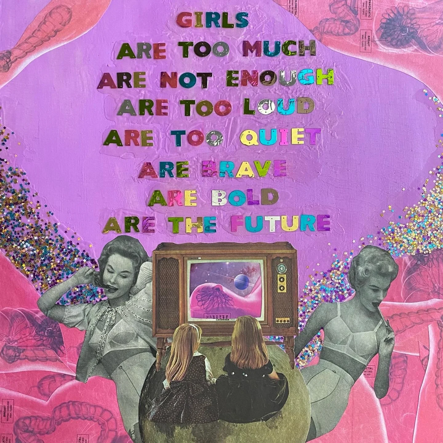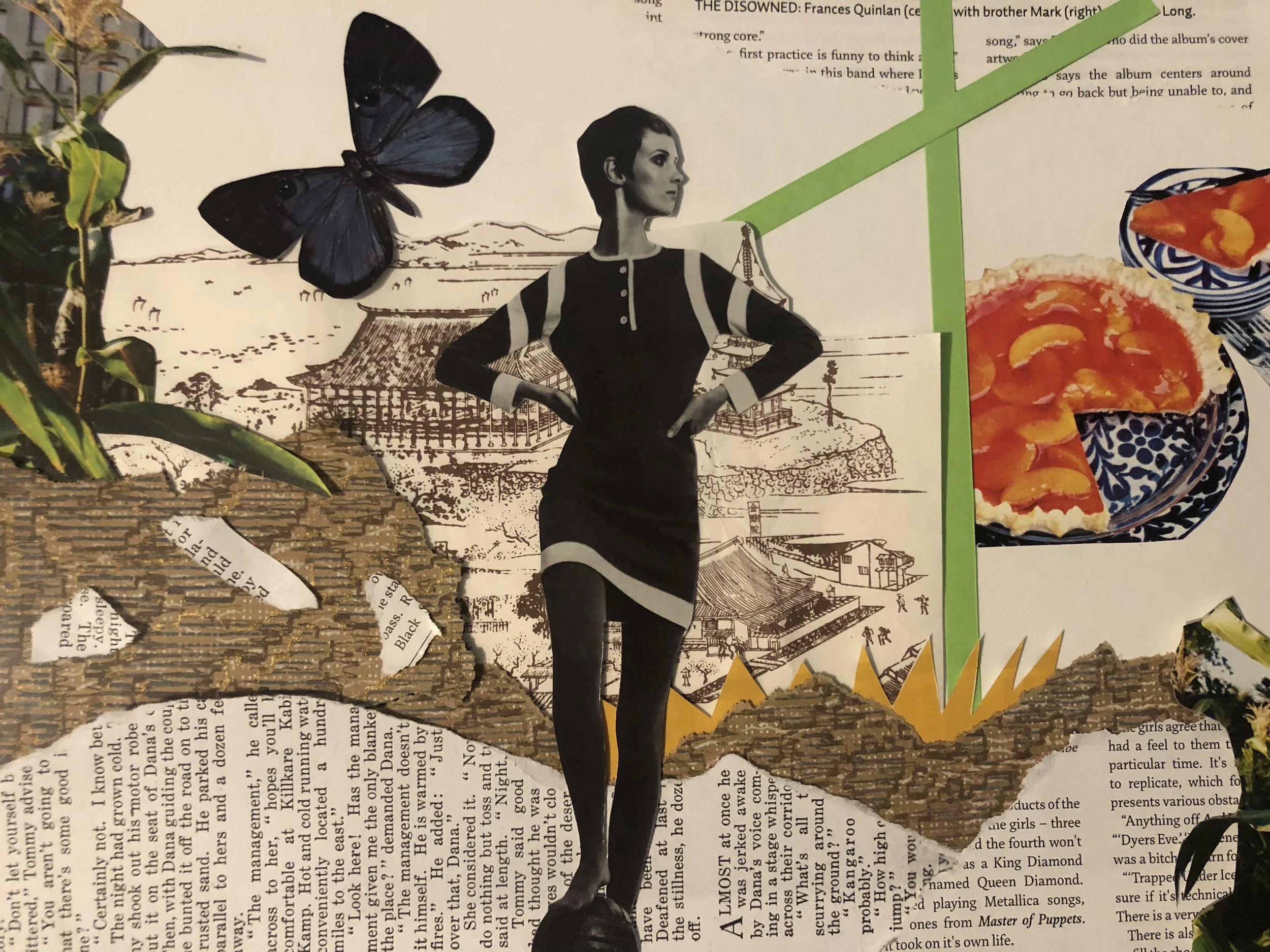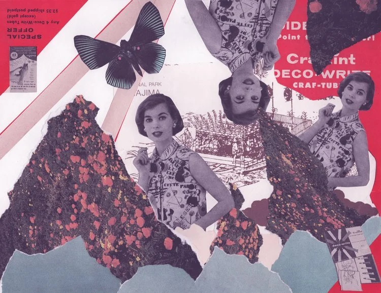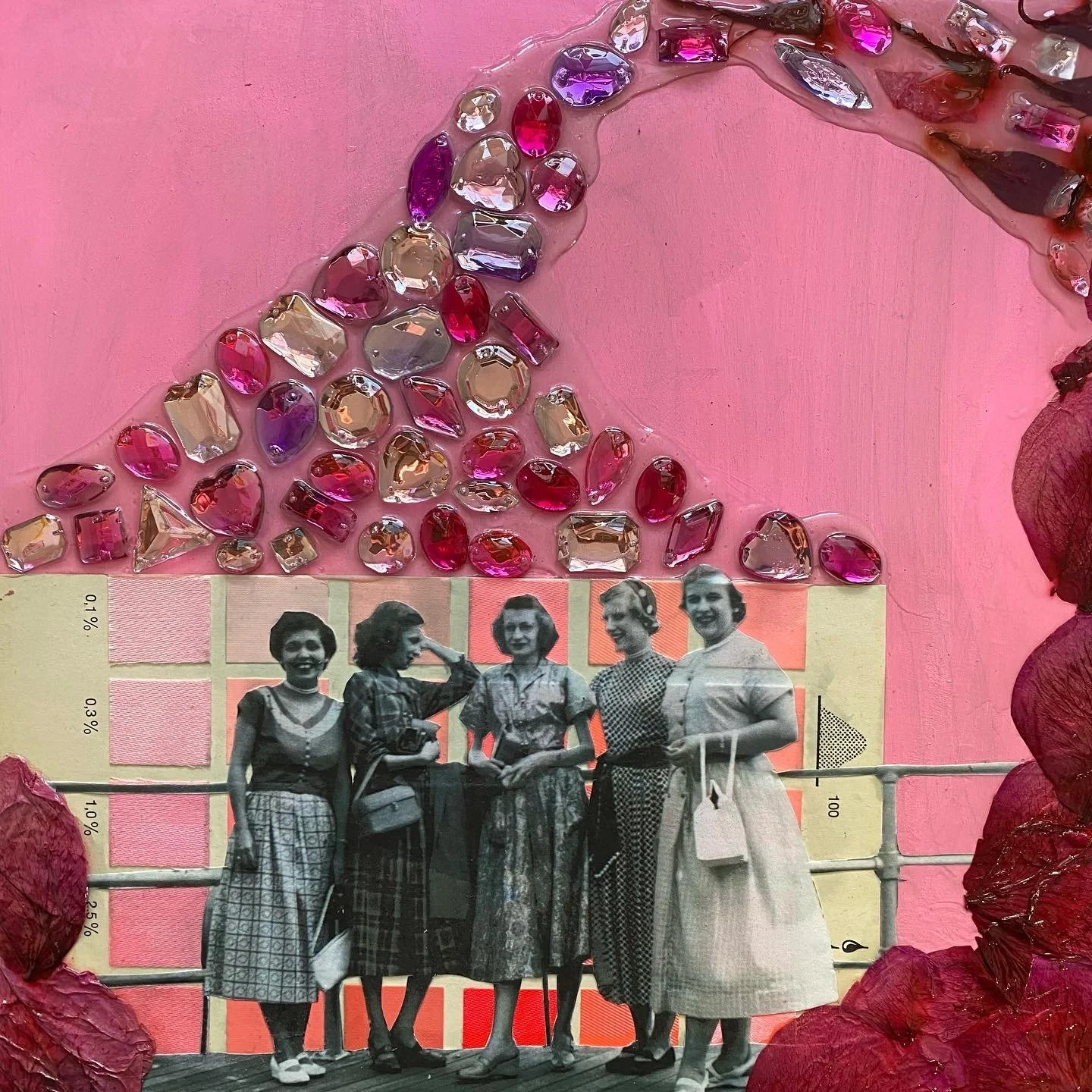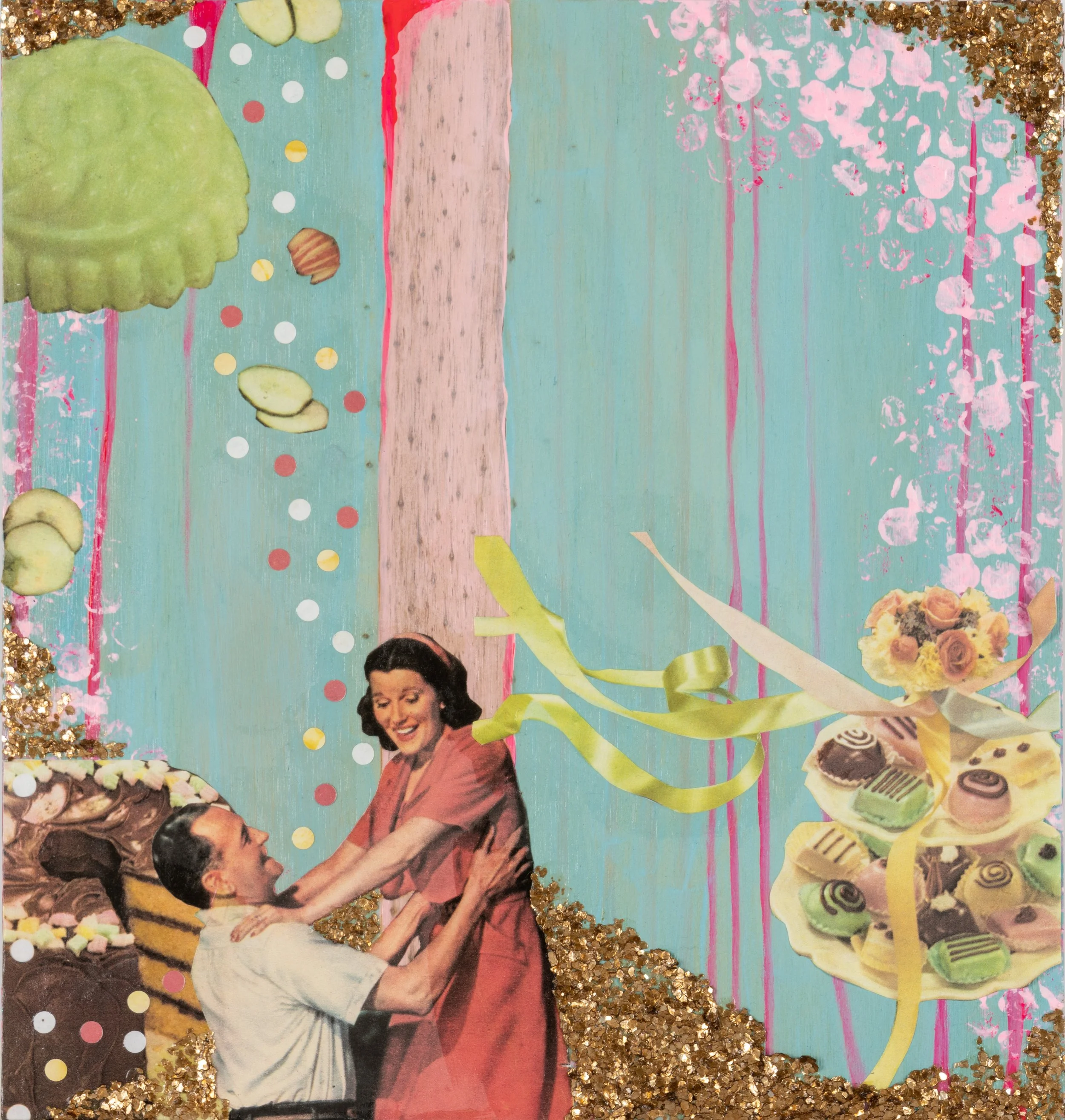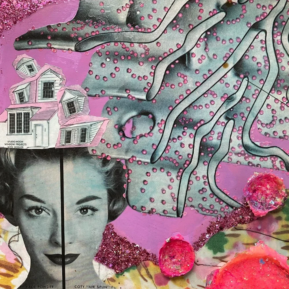 Creating work encourages me to deep dive into history through the use of collected recycled imagery dated as early as the late 1800’s, such as vintage magazines and books. When examining advertisements, photographs, and texts throughout time, I observe how beauty standards and expectations in gender roles have shifted over the years. The evolution of the fields of medicine and science is also of particular interest to me. I simultaneously alter the stories of the images I find and infuse them with personal meaning. Creating wonderlands for women of the past to experience new lives serves as a source of joy for me. My work is playful or silly at first, but I hope viewers look beyond the glitter to reveal the deeper themes, and perhaps relate it to their own experiences. My work is a step towards the light for me, and I hope looking at it can provide a sense of magic and hope for others.