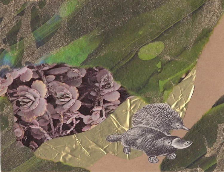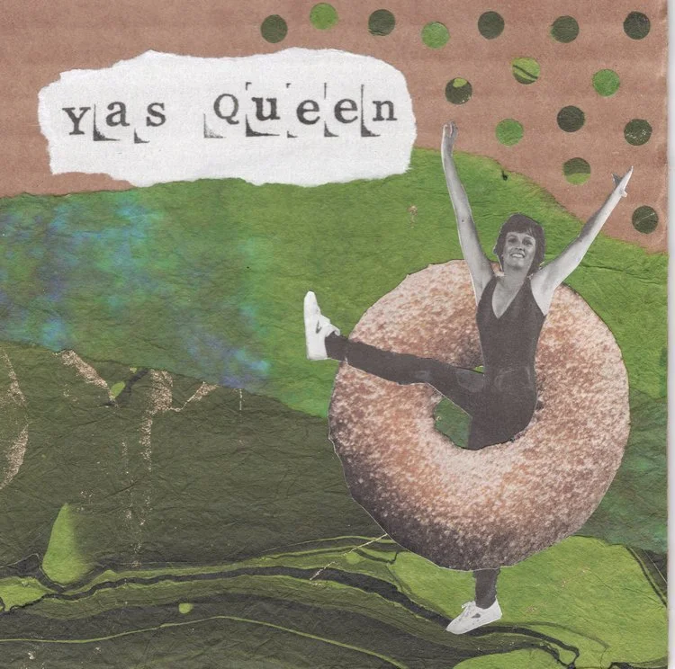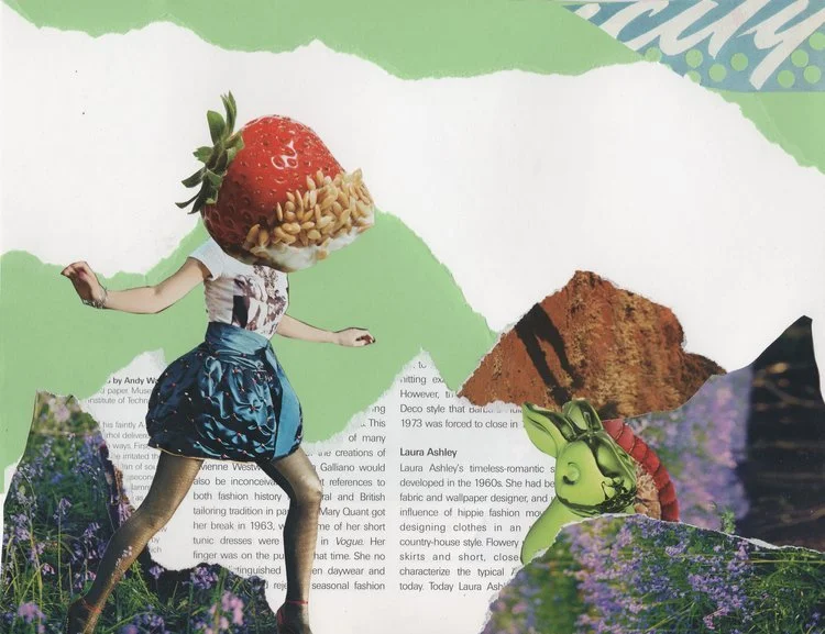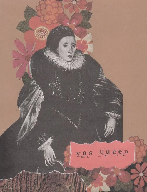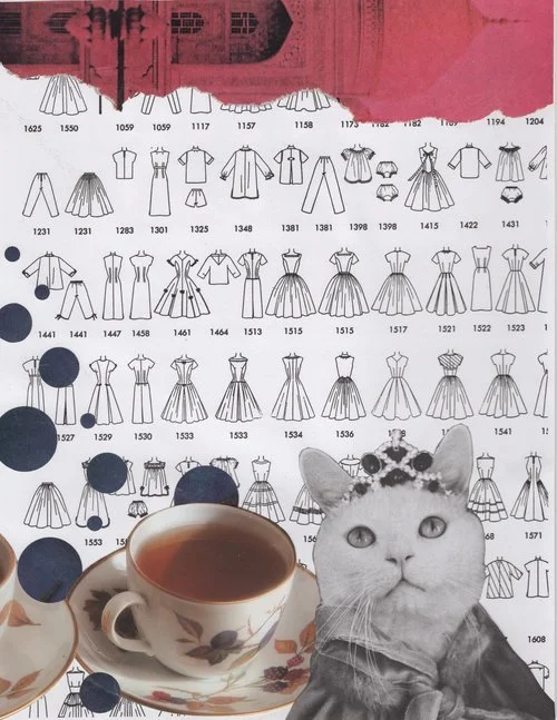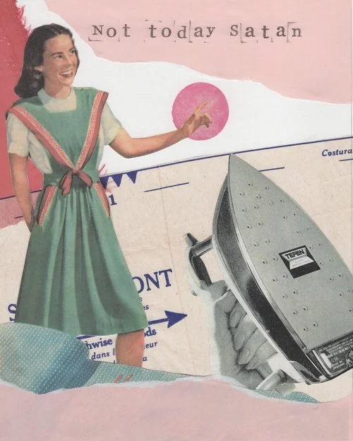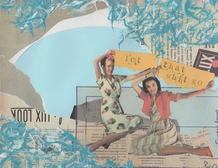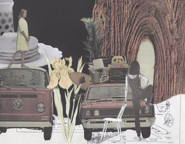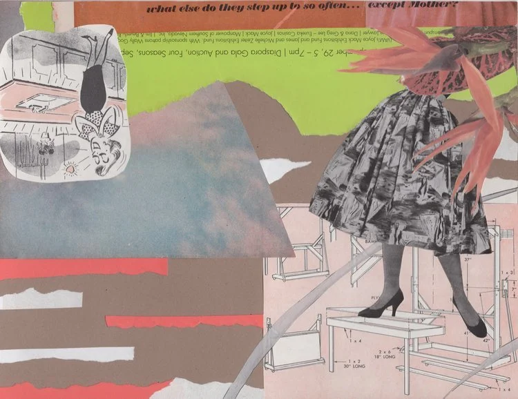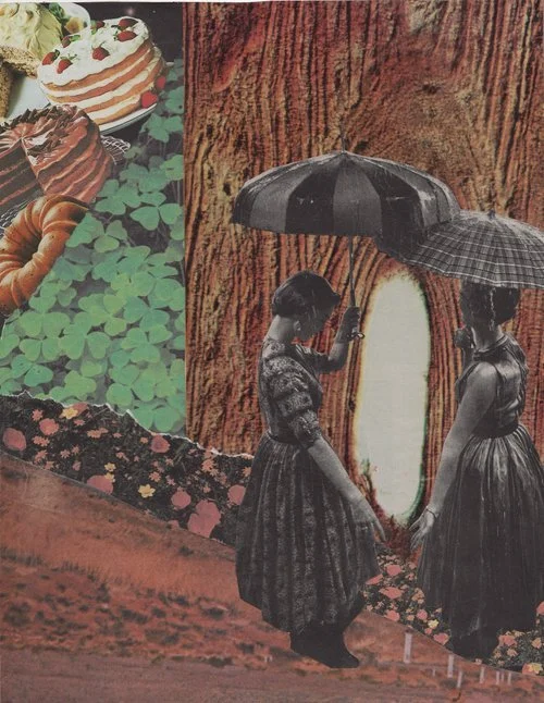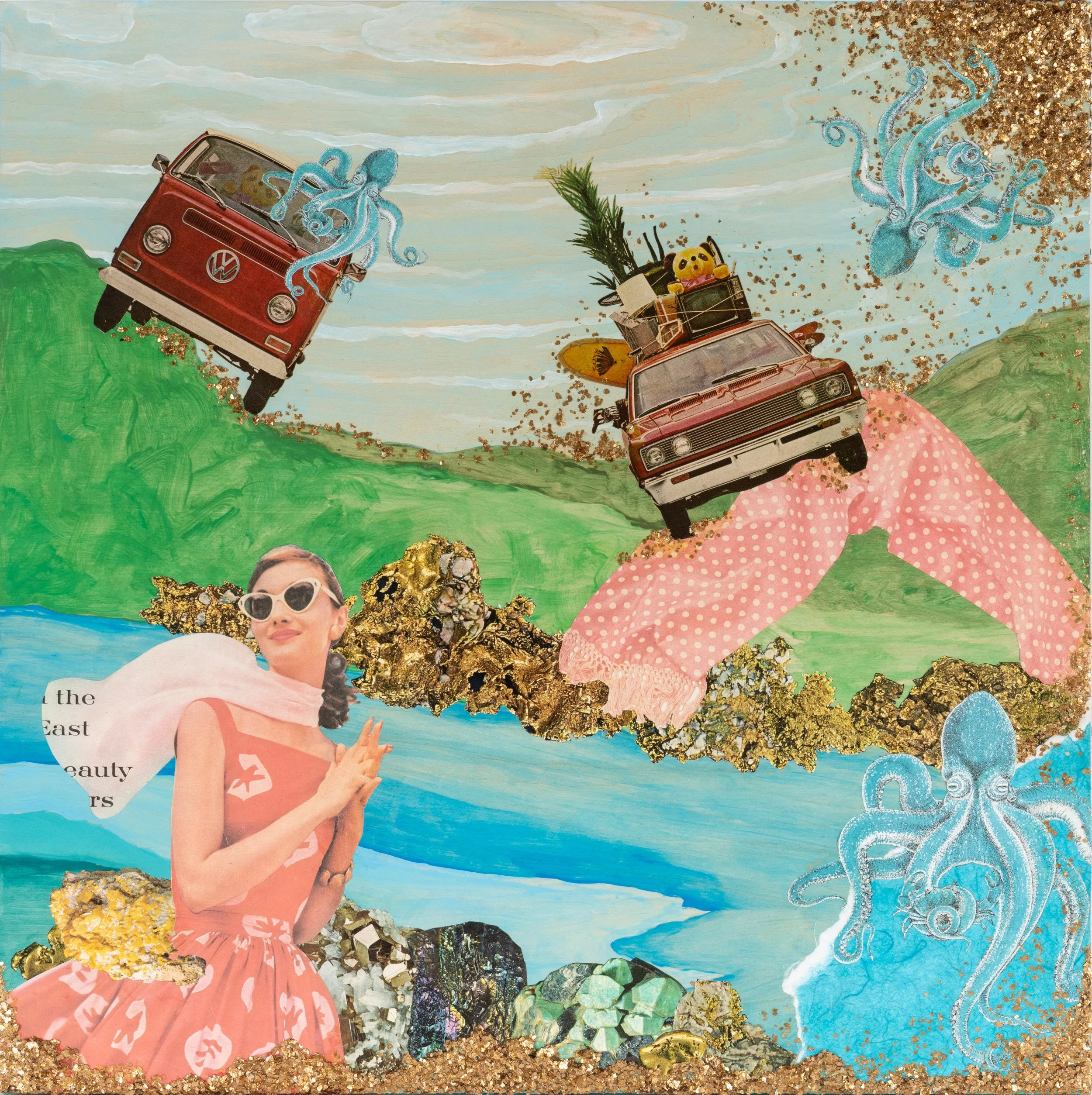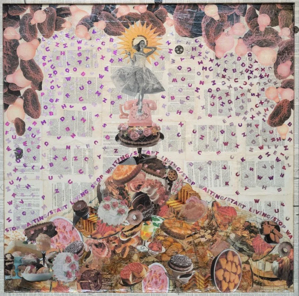 Creating work encourages me to deep dive into history through the use of collected recycled imagery dated as early as the late 1800’s, such as vintage magazines and books. When examining advertisements, photographs, and texts throughout time, I observe how beauty standards and expectations in gender roles have shifted over the years. The evolution of the fields of medicine and science is also of particular interest to me. I simultaneously alter the stories of the images I find and infuse them with personal meaning. Creating wonderlands for women of the past to experience new lives serves as a source of joy for me. My work is playful or silly at first, but I hope viewers look beyond the glitter to reveal the deeper themes, and perhaps relate it to their own experiences. My work is a step towards the light for me, and I hope looking at it can provide a sense of magic and hope for others.